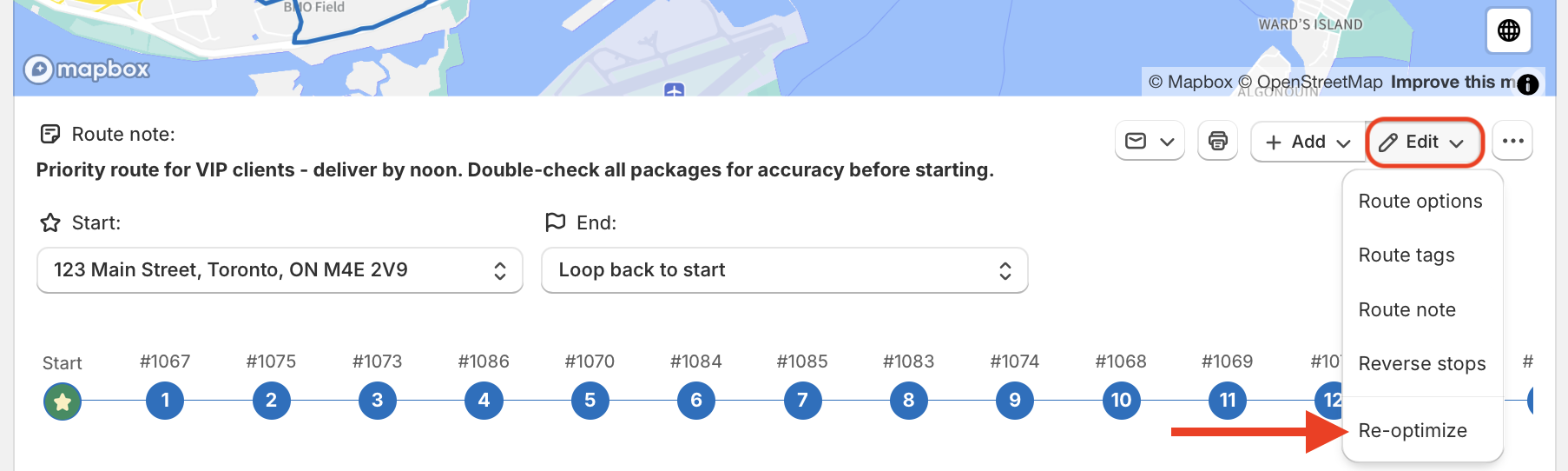 If you have made changes to your route and you wish to re-optimize it, access the Edit menu found directly underneath the map when viewing any individual route, and select Re-optimize: