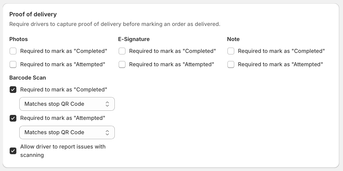 Proof of Delivery can be made mandatory to mark an order as delivered and/or attempted from your EasyRoutes Settings > Driver settings tab, in the Proof of delivery section:
