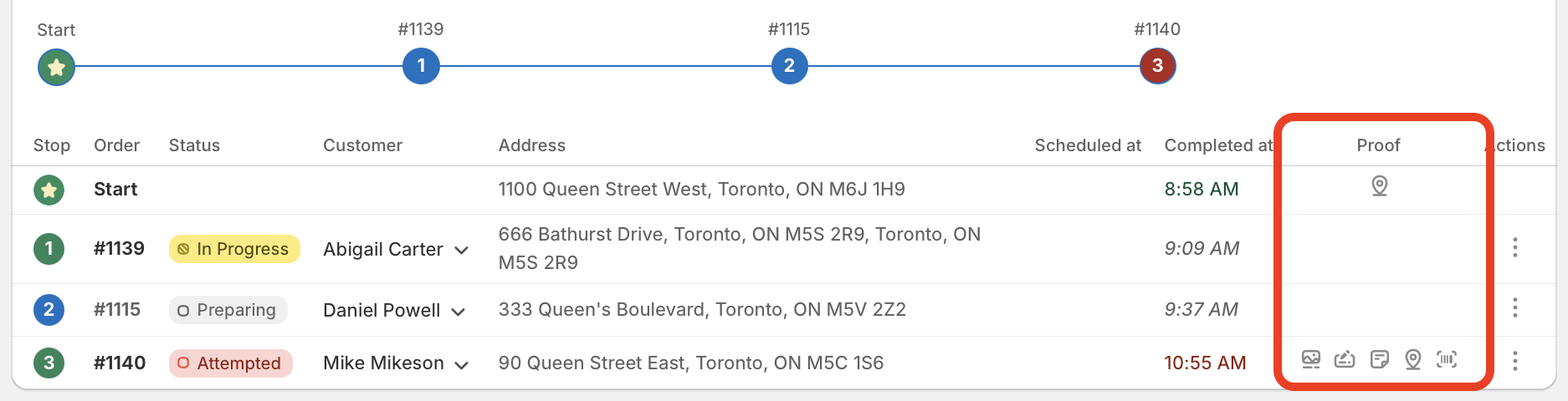 For completed routes or routes in progress, a series of icons under the "Proof" column on each stop's entry indicates which Proof of Delivery items were captured for that stop: