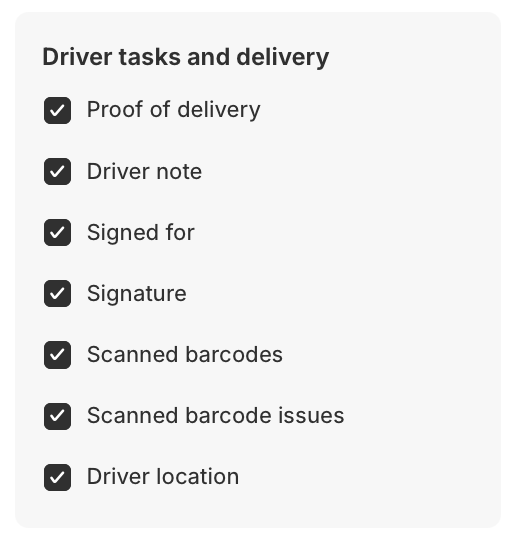- From the Export menu that appears, select the Stop data button at the top of the page. Ensure the Proof of delivery, Driver note, Signed for, Signature, and Driver location checkboxes are selected; any other variables can also be included (we also recommend including Order name for identification purposes):