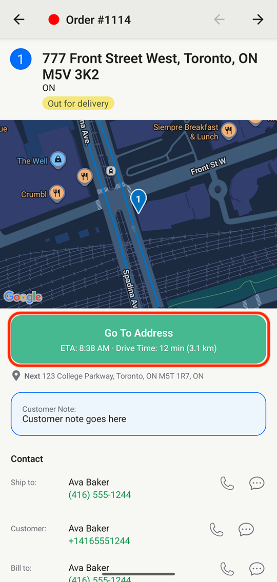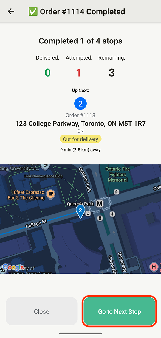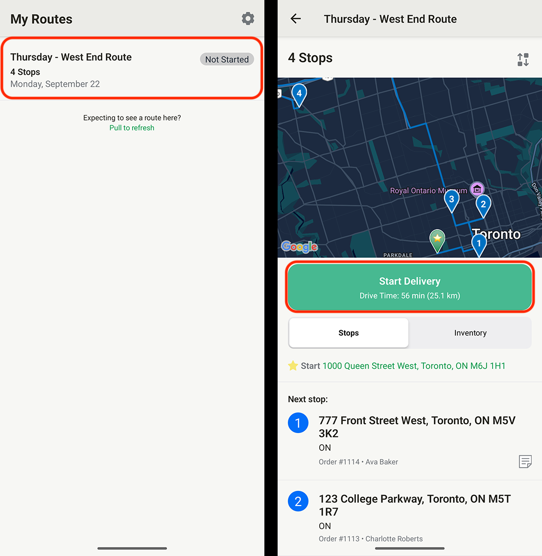 Click the Start Delivery button to begin your route. You will be taken to the first stop in your route. When you are viewing a stop, you can click the Go To Address button to navigate to the address.