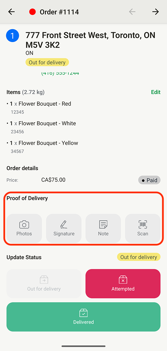 See detailed information for each order you are delivering, including important delivery notes. You can get directions to your stops using your favourite navigation app (Apple Maps, Google Maps, or Waze). Once you have dropped off an order you can attach multiple photos, a signature or an optional note as proof of delivery. You can then mark the order as delivered before moving on to your next stop.