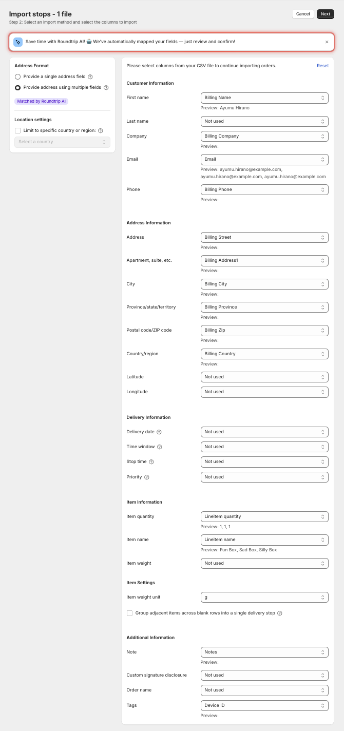 If you upload a spreadsheet in the same format as one that was successfully imported and added to the map, EasyRoutes will remember your previous mapping from the last time.
