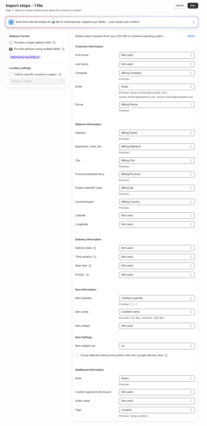 We also currently provide support for importing First Name, Last Name, Company, Email, Phone, Note, Delivery Date, Time Window (customer's preferred delivery timeframe), Stop Time (how long to spend at a particular stop), Priority status, Latitude, Longitude (both values must be included to properly parse), and Order name as independent, optional columns for all orders. You can also include item details for each stop - full details below.