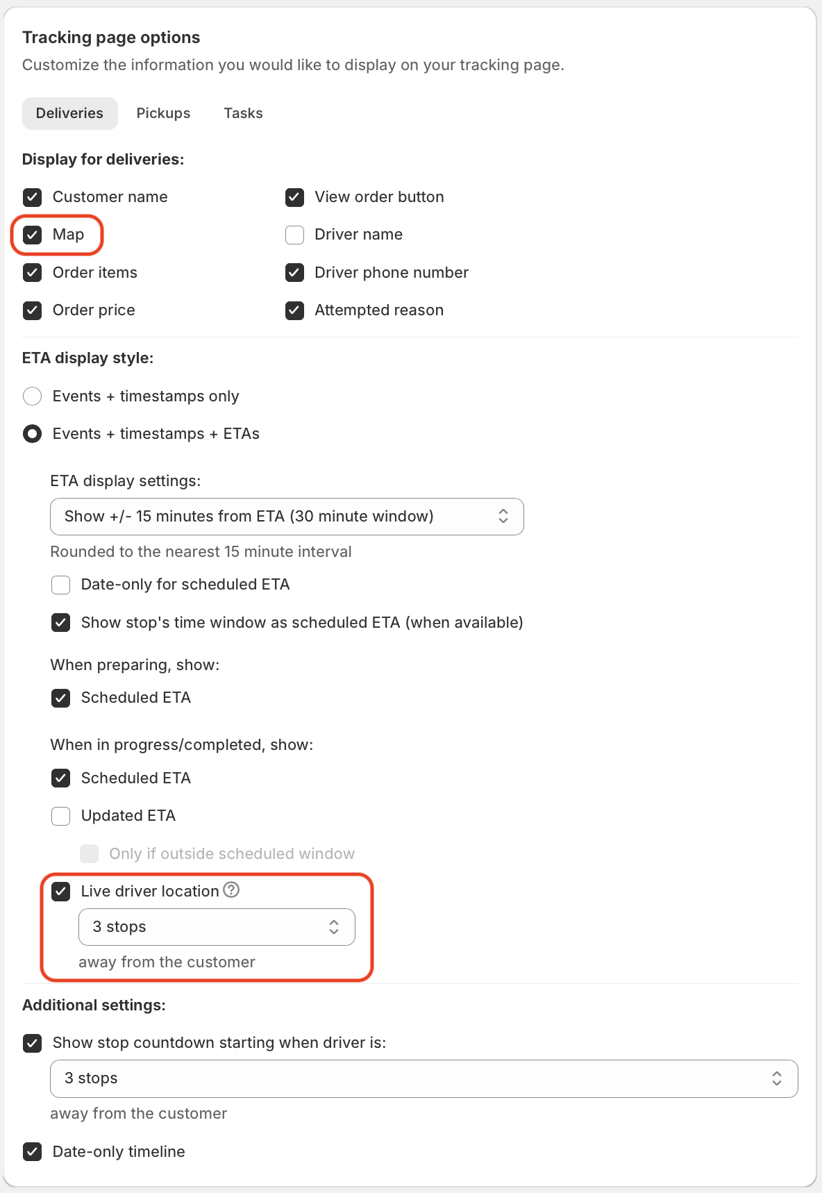 - Use the dropdown menu below to configure when a driver's live location will be displayed (from 1 stop away to 10 stops away from a customer).