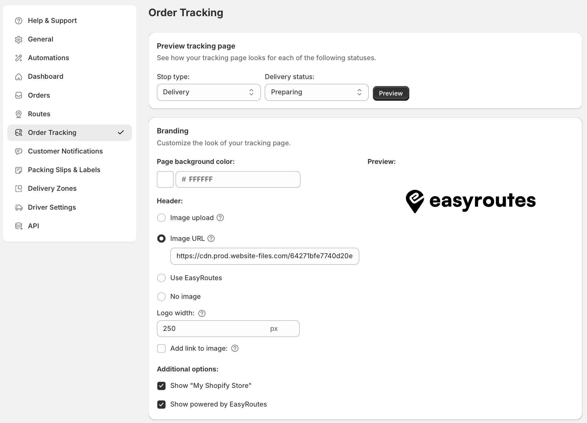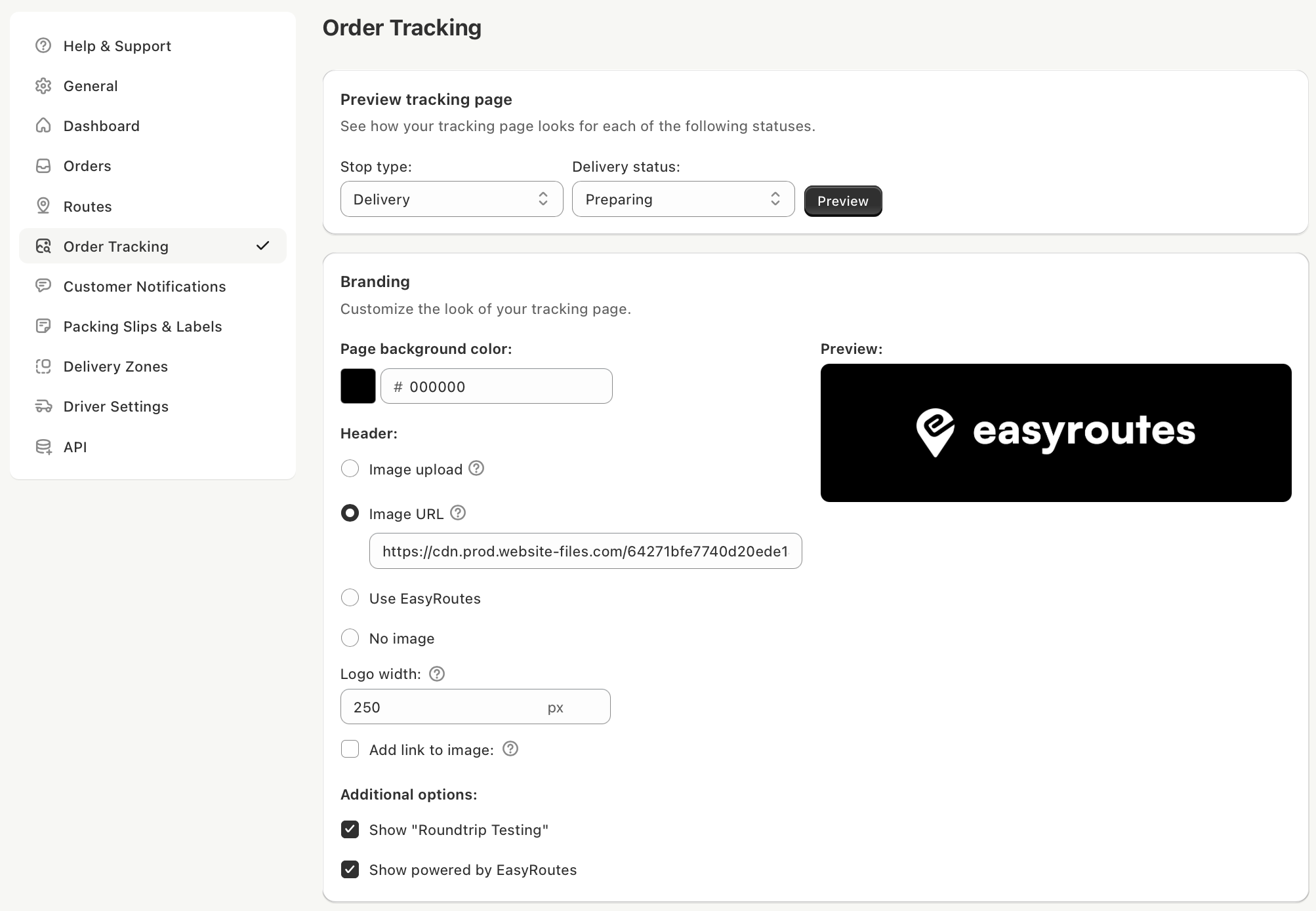 To edit your Tracking Pages, access your EasyRoutes Settings > Order tracking tab: