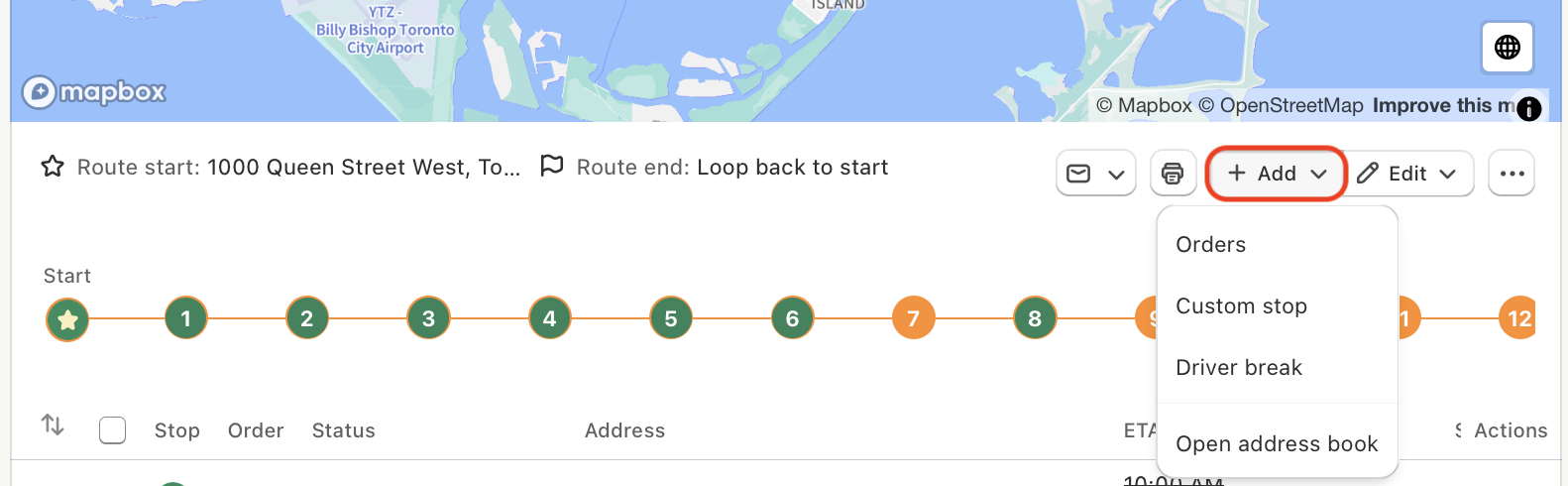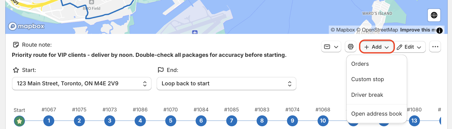 - Add menu: Contains controls for adding orders, custom stops, or driver breaks to the route, as well as quick access to stop details stored in the address book: