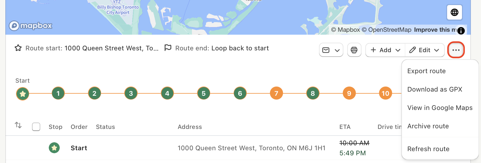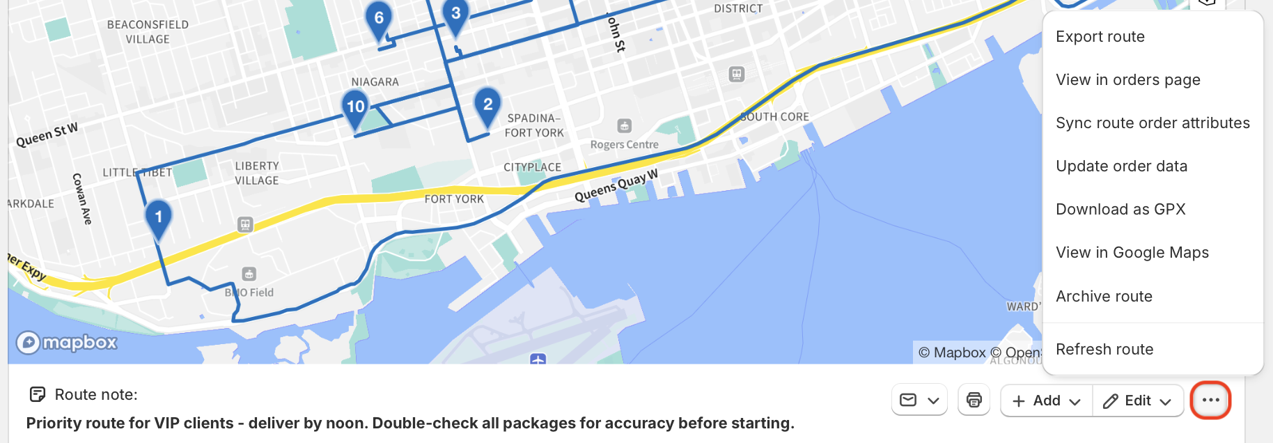 - Actions menu (three dots icon): Contains controls for exporting, downloading & archiving a route; viewing a route's orders in the Shopify Orders page, or as a stop sequence in Google Maps; as well as updating and refreshing a route's data: