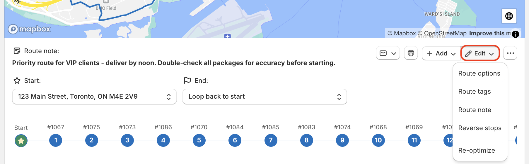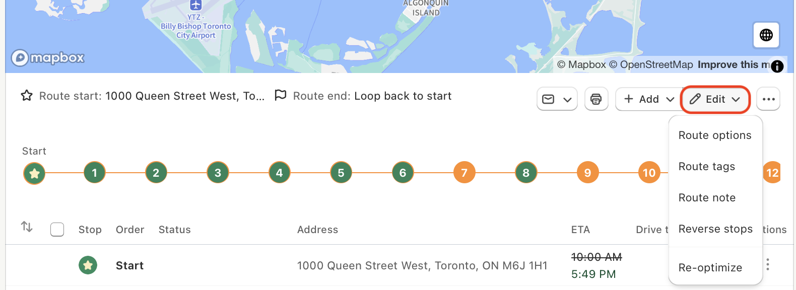 - Edit menu: Contains controls for editing route options, updating route tags and route notes, reversing the route's stop order, or re-optimizing the route: