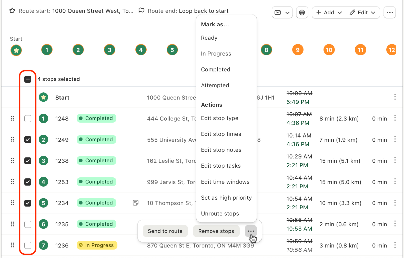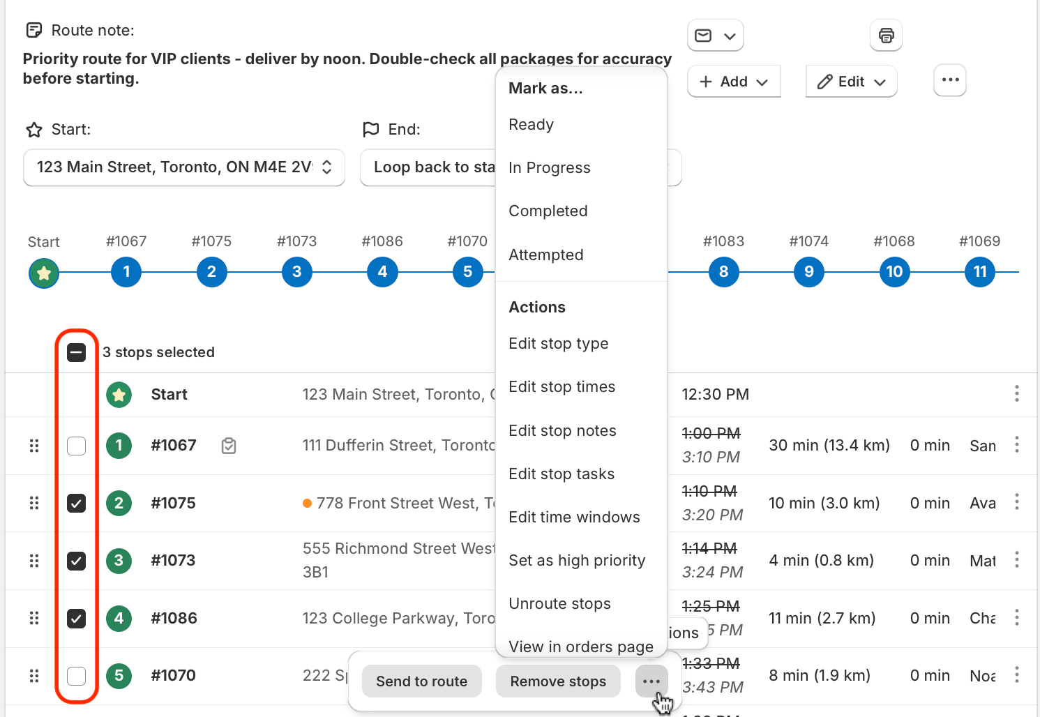 - Access the Actions menu (three dots icon) on the right of each stop to access settings for a single stop, including to Edit or Remove the stop, mark it as Priority, send it to another route, and more: