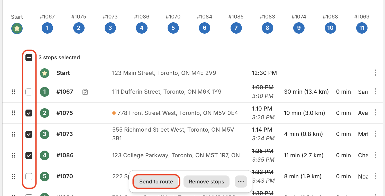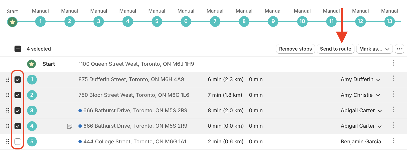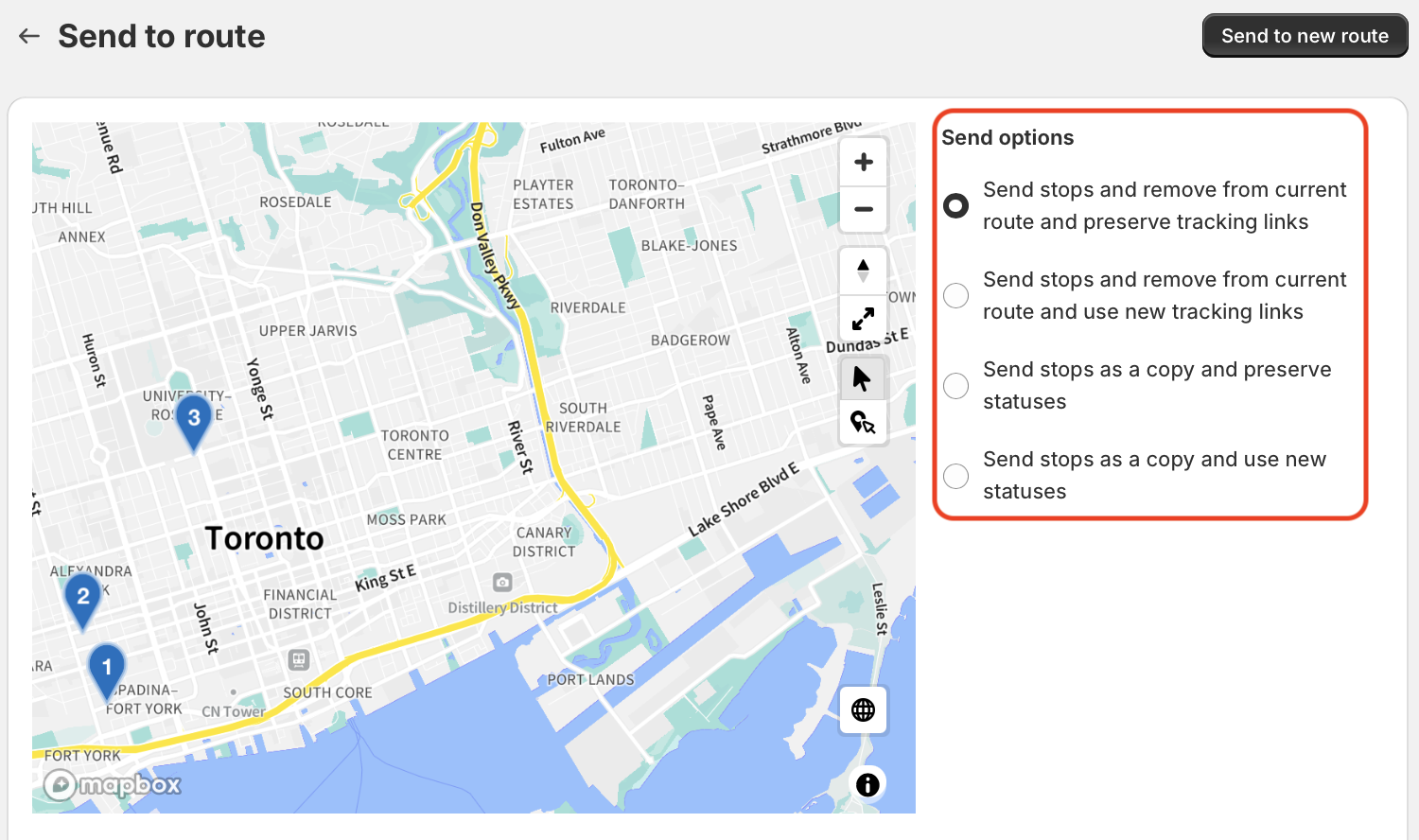 - Select the route you want to send the stops to from the list of routes below the map, or click the Send to new route button on the top right to send stops to a brand new route.