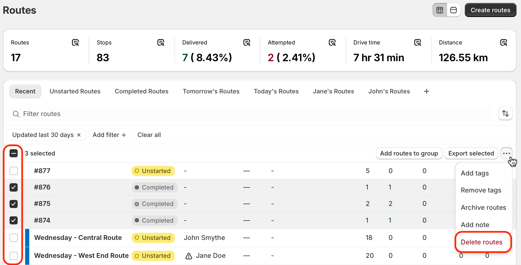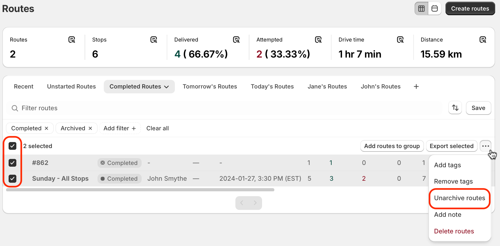 - From the Routes Page, use the checkboxes to select any route(s) you'd like to archive.