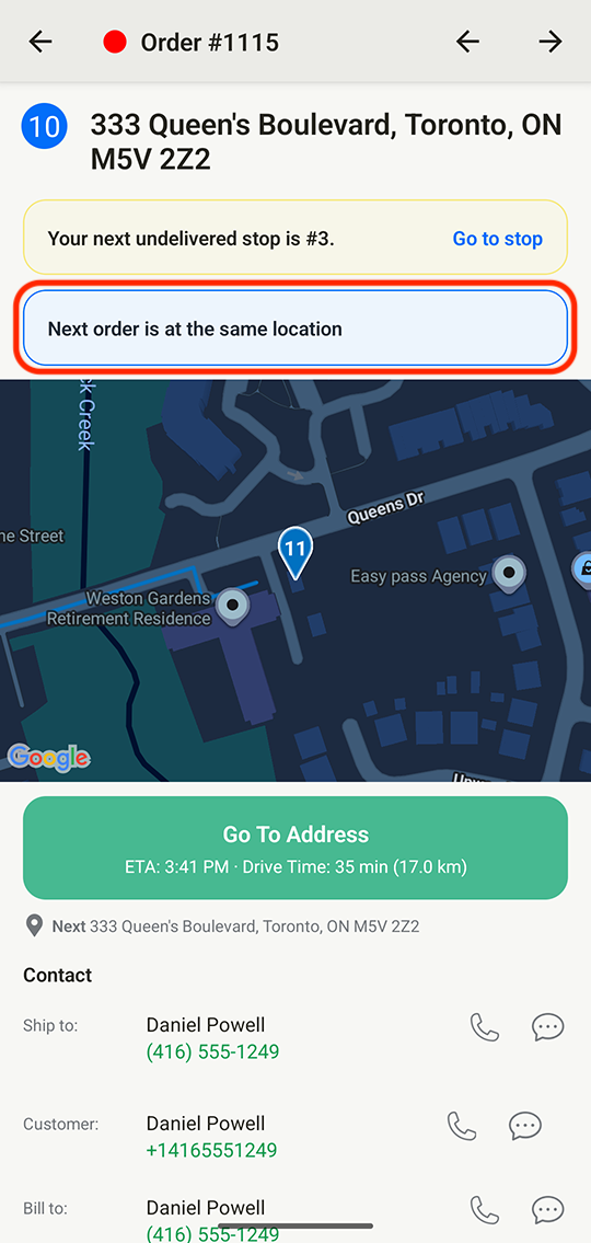 EasyRoutes will let you know if more than one order is at the same location. This is visible above your map when viewing a stop: