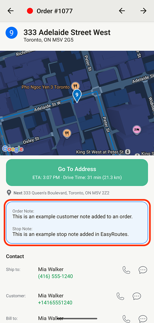 Customer notes, order notes, stop notes, and any stop instructions imposed by your EasyRoutes settings can be found in below the navigation button when viewing individual stops: