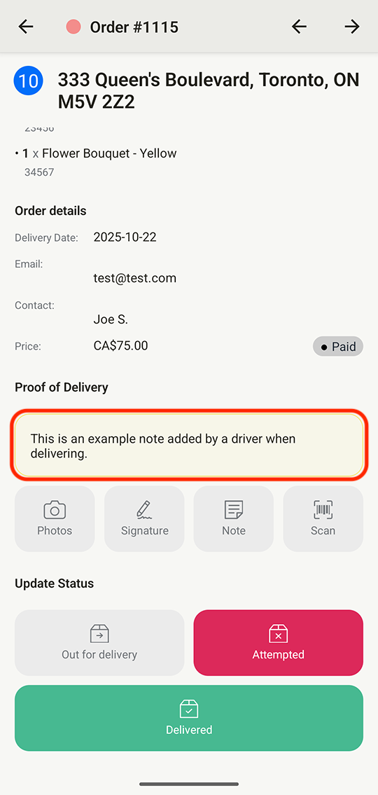 Notes included by a delivery driver as Proof of Delivery will be listed under the Proof of Delivery section further down the page: