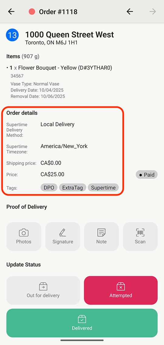 Once enabled, Order tags and Attributes will display immediately below any customer/item information for each stop within the mobile app: