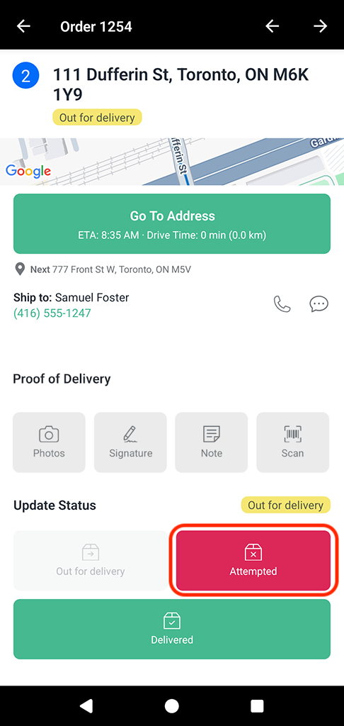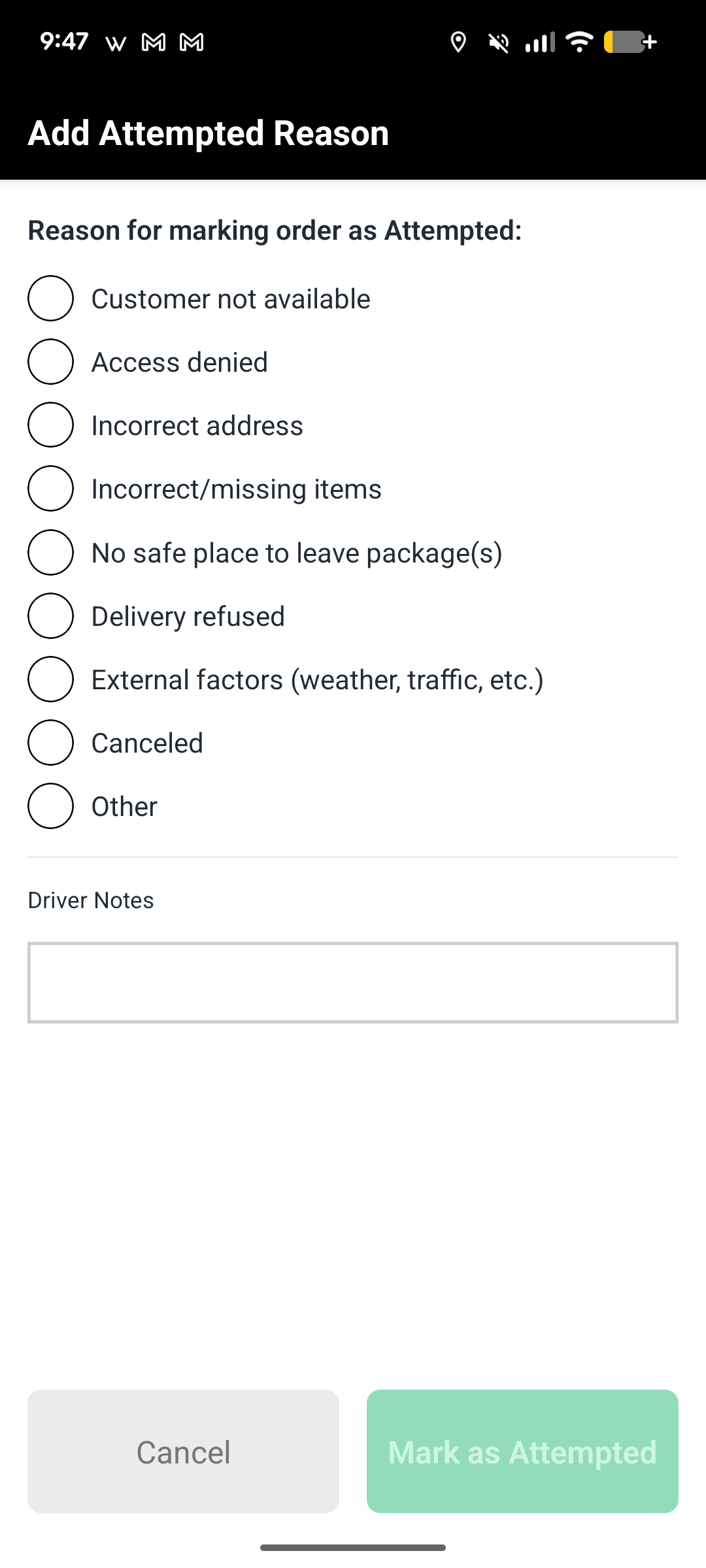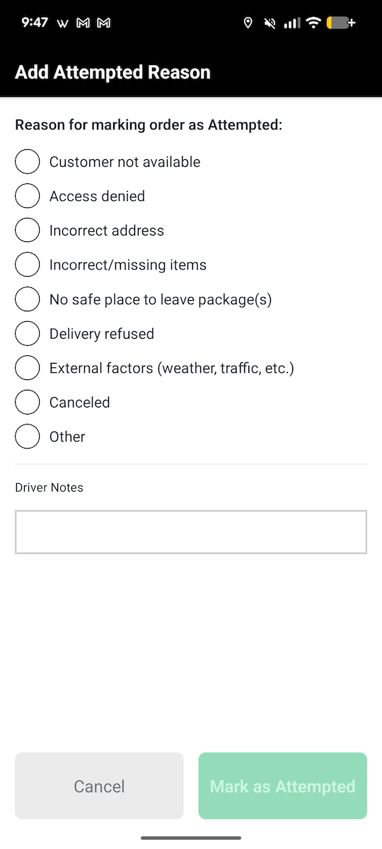 - Tap the Attempted button. You'll be prompted to choose from a list of preset reasons why the stop could not be completed successfully (Customer not available, Access denied, Incorrect address, Incorrect/missing items, No safe place to leave package(s), Delivery refused, External factors (weather, traffic, etc.)), canceled, or input a custom reason as a note, before tapping Mark as Attempted: