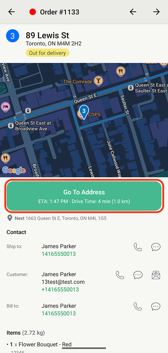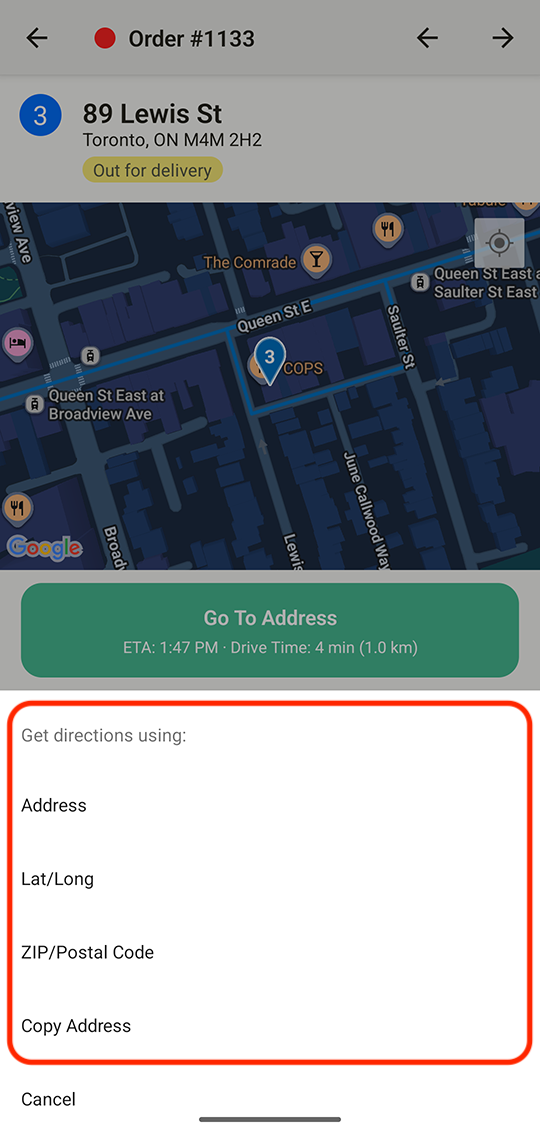 - It will open to the stop's address using the navigation tool configured in your driver app settings. If you long press this button, you can choose a different navigation mode for this stop, or copy the stop's address text to your device's clipboard: