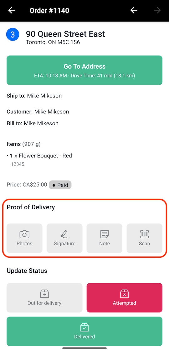 You can attach photos, an eSignature, and/or a custom note as proof of delivery. To do so: