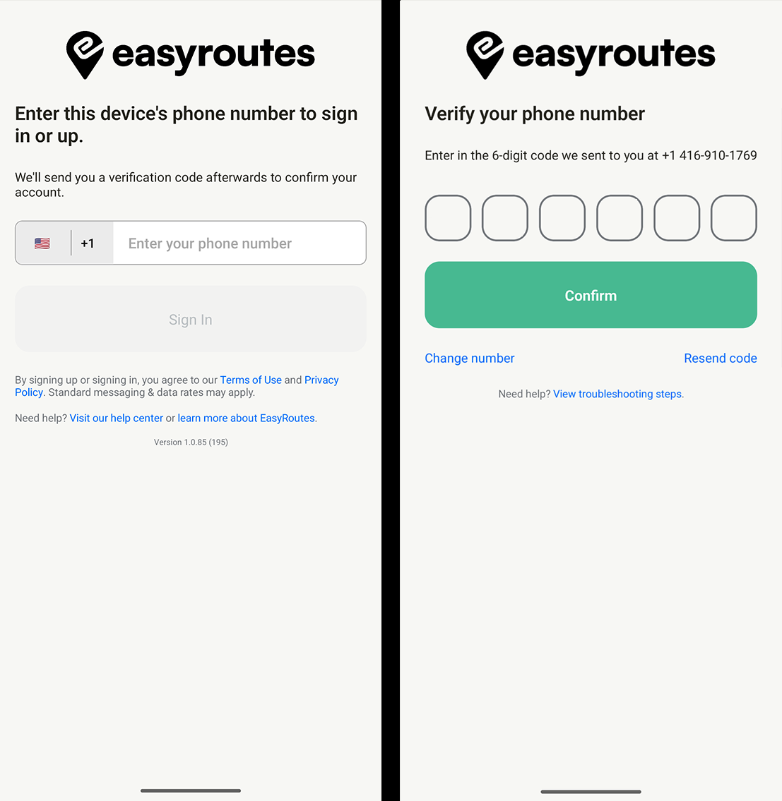 When you first open EasyRoutes, you will be presented with a screen where you can enter your device's phone number to sign in or sign up for EasyRoutes Delivery Driver. After tapping the Sign In button (below, left), we will send you an SMS message with a verification code - input this code on the following screen (below, right):