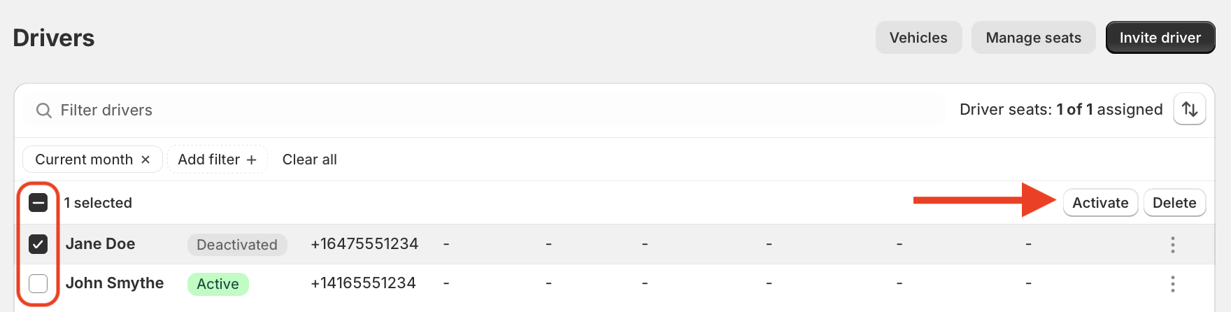 - Select the driver(s) you want to deactivate by clicking the checkbox next to their name(s).