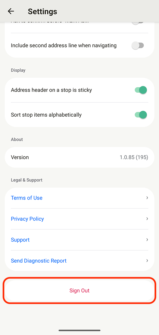 How do I sign out of EasyRoutes Delivery Driver? To sign out of EasyRoutes Delivery Driver, tap on the Settings icon in the top right of the app's home page: Tap the Sign Out button at the bottom of the settings page: