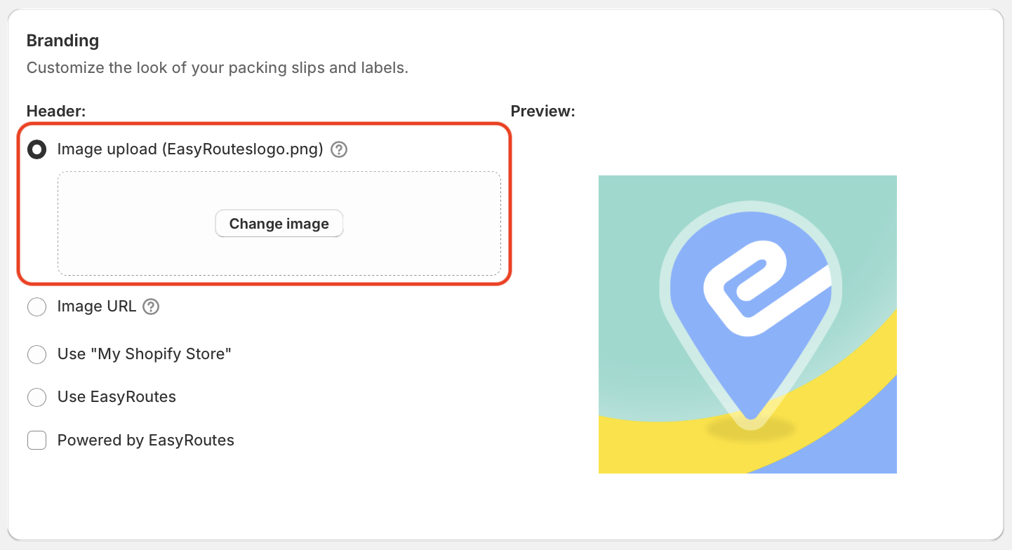 To include a logo or image, use the Image upload option within the Branding section shown below - this option is available from your EasyRoutes Settings, within the Customer Notifications, Order Tracking, and Packing Slips & Labels tabs: