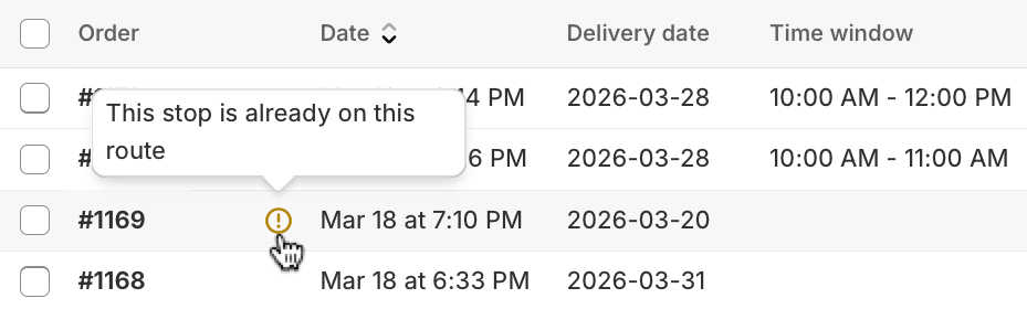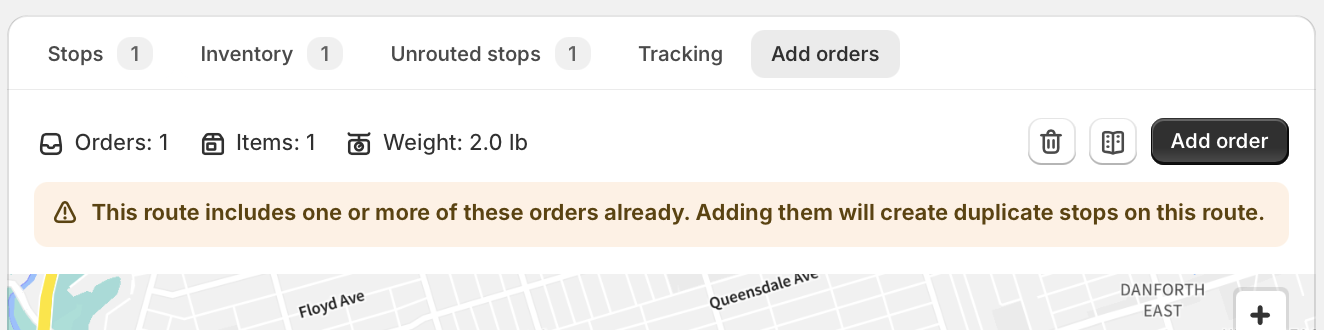 Further, when viewing any existing route's Add orders tab, any orders in the table that are already included in the route will display with a unique warning: