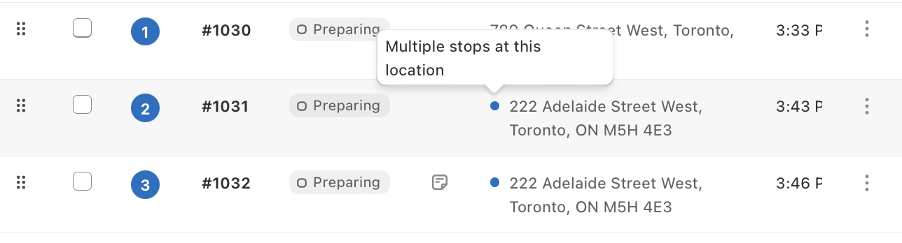 Orders/stops that share the same address and are added to the same route will be grouped together to provide the most optimal route. While EasyRoutes doesn't directly combine these stops (to maintain any distinct delivery access requirements or special requests that may differ between the two stops), we make it easier to see when multiple orders at the same location for you and your drivers: