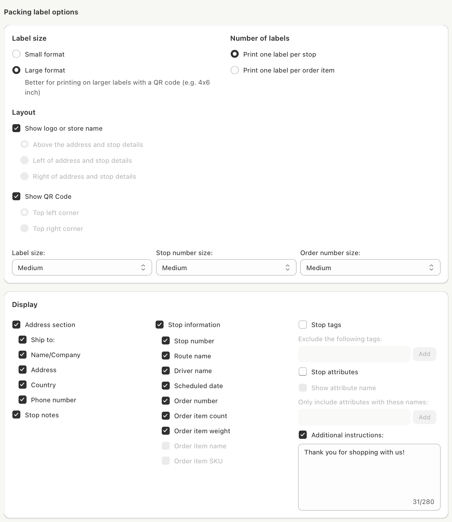 These packing labels can be further customized to print in large or small format; include a number of different variables; print labels per order item or per overall stop; or to adjust font sizes, logo placement, and custom messaging included on all printed labels. Note that some stop/order items may only be available when opting to print one label per stop (e.g. Order price) versus printing one label per order item (e.g. Order item name & Order item SKU).