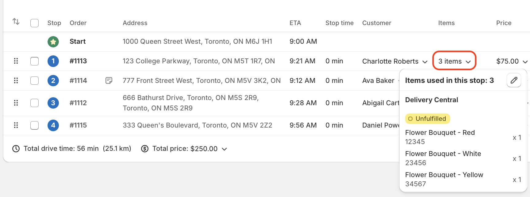 When configured in your EasyRoutes Settings > Routes tab, item inventories for each stop can be accessed via the dropdown found in the Items column, and can be edited directly using the edit (pencil icon) button displayed alongside each stop's inventory panel: