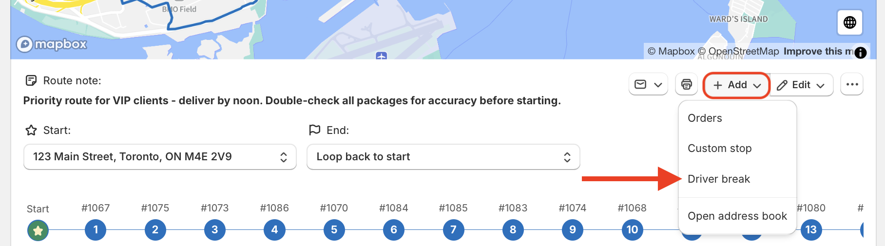 Breaks can also be added individually to routes after they've been planned and optimized. When viewing any existing route, access the + Add menu directly below the map, and select the Driver break option: