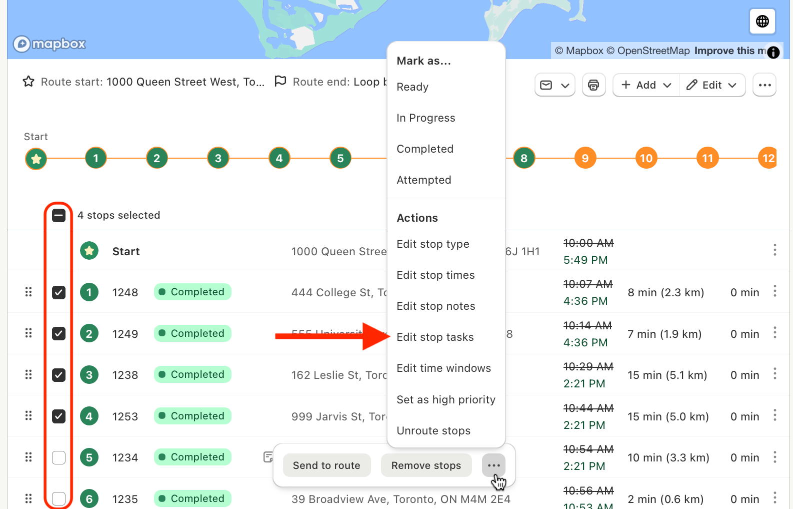To edit tasks for multiple stops in bulk, use the checkboxes to multi-select the stops you wish to edit, and choose Edit stop tasks from the actions menu at the bottom of the page: