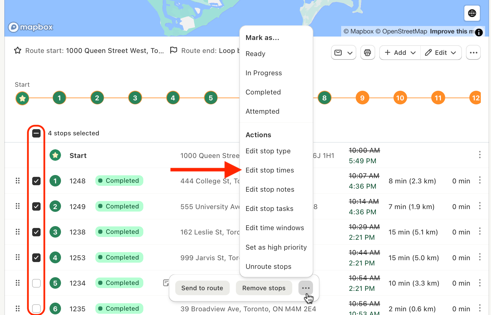 Once you've created a route, you can edit the Time per stop value for individual stops within that route to accommodate for cases where some stops may take more or less time than the overall value. This can be completed per stop individually, or for multiple stops at once by selecting more than one checkbox: