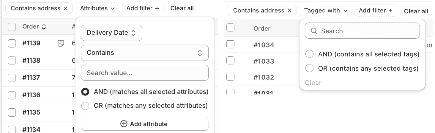 If you use a third-party app that updates order tags or attributes with additional information, you can filter with these too. If you want to view these columns, select the "Configure table columns" button above the orders table on the Orders tab tab, ensure the Order tags and Attributes checkboxes are selected for your Orders page Columns: