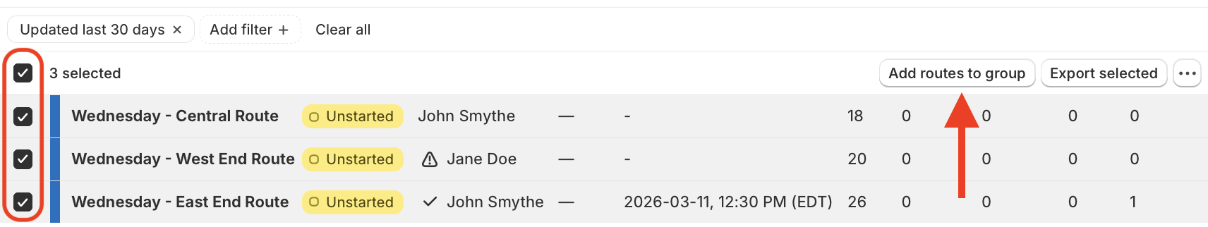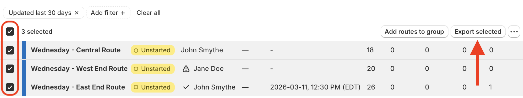 Access the Routes page from the EasyRoutes navigation menu and follow the steps below to bulk export routes, add multiple routes to a route group, or archive routes as a batch.