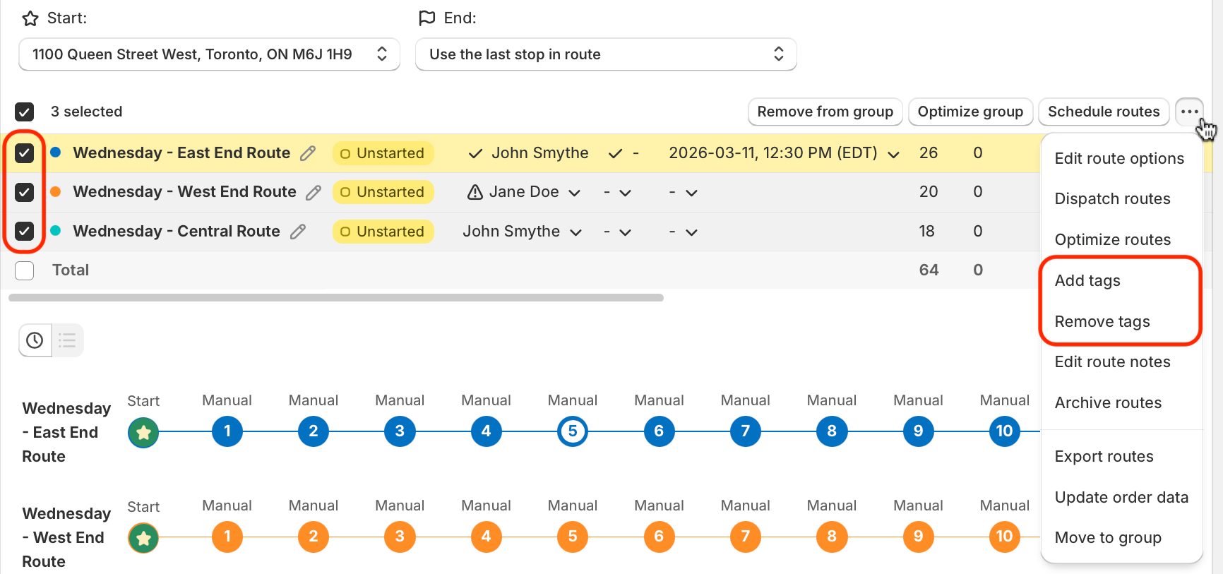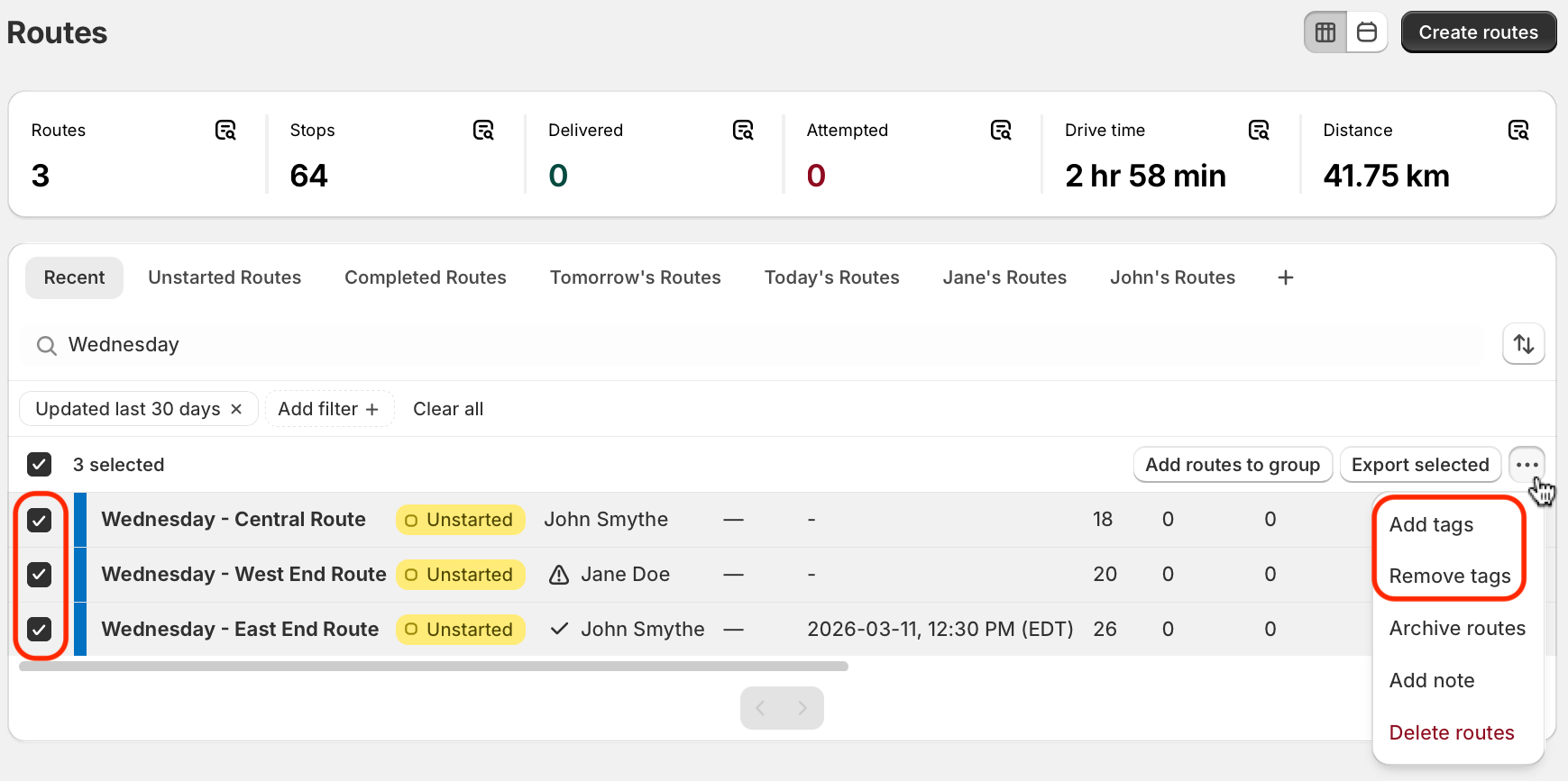 Access any previously created route and follow the steps below to bulk re-order stops, apply delivery statuses to multiple stops, edit stop times, tasks, or priority status of multiple stops, and more.