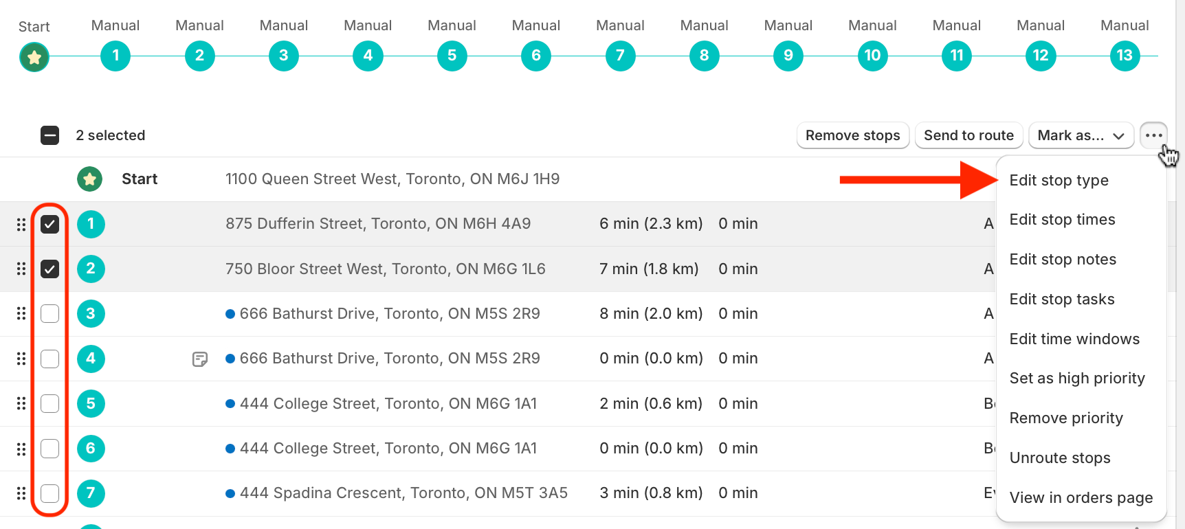 Use the checkboxes to select any stops you want to update the stop type for. From the menu that appears in the upper right-hand corner of the table, click into the More actions menu (three dots icon) and select Edit stop type: