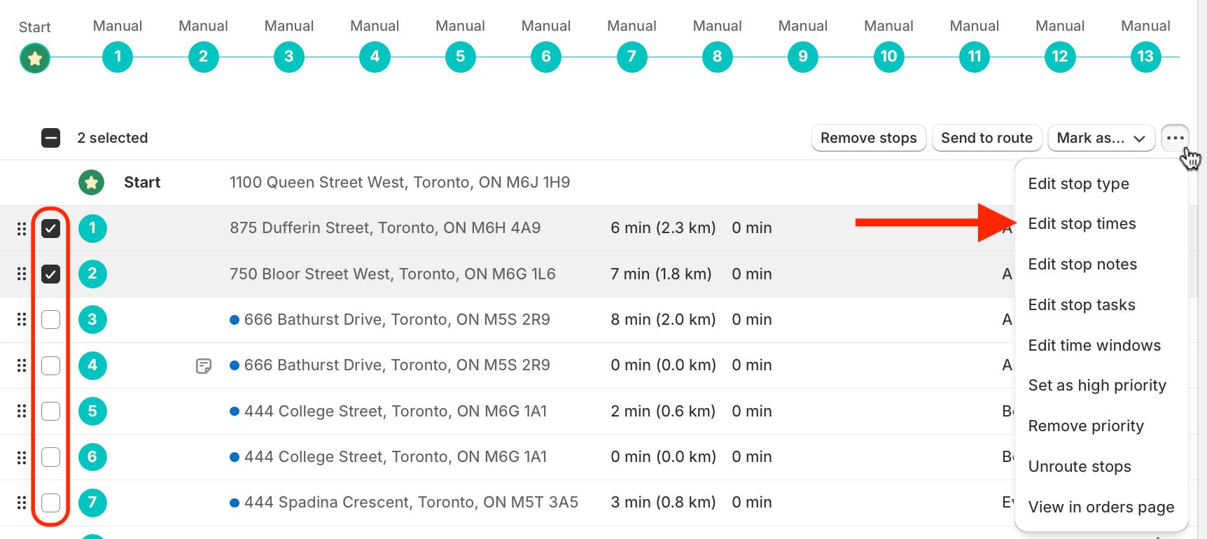 Use the checkboxes to select any stops you want to update the stop time for. From the menu that appears in the upper right-hand corner of the table, click into the More actions menu (three dots icon) and select Edit stop times: