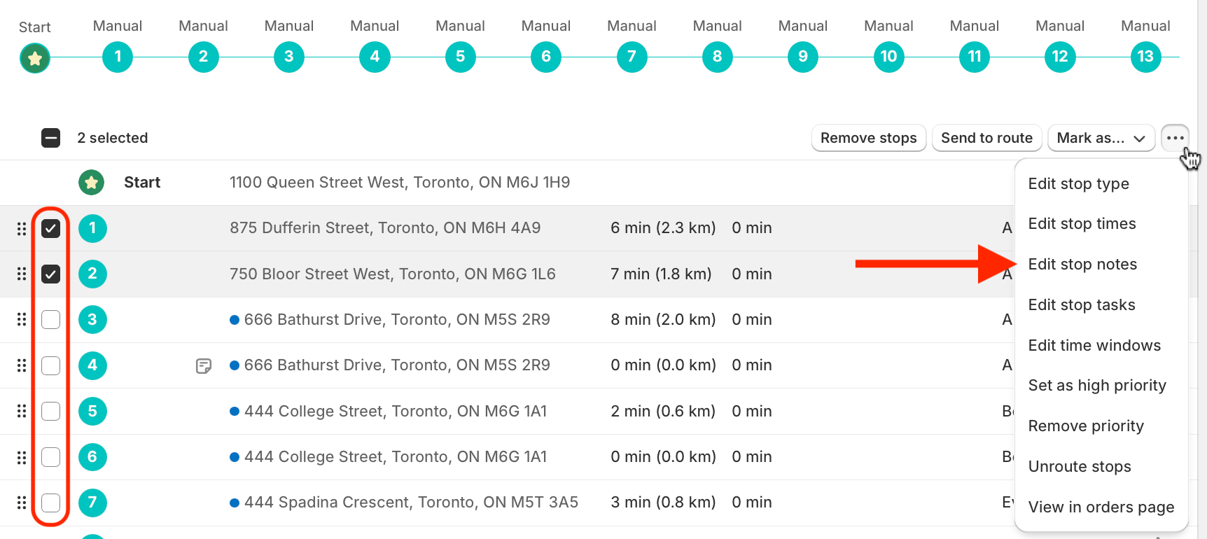 Use the checkboxes to select any stops you want to edit the stop note for - note that this action will overwrite any existing stop notes associated with the selected stops. From the menu that appears in the upper right-hand corner of the table, click into the More actions menu (three dots icon) and select Edit stop notes: