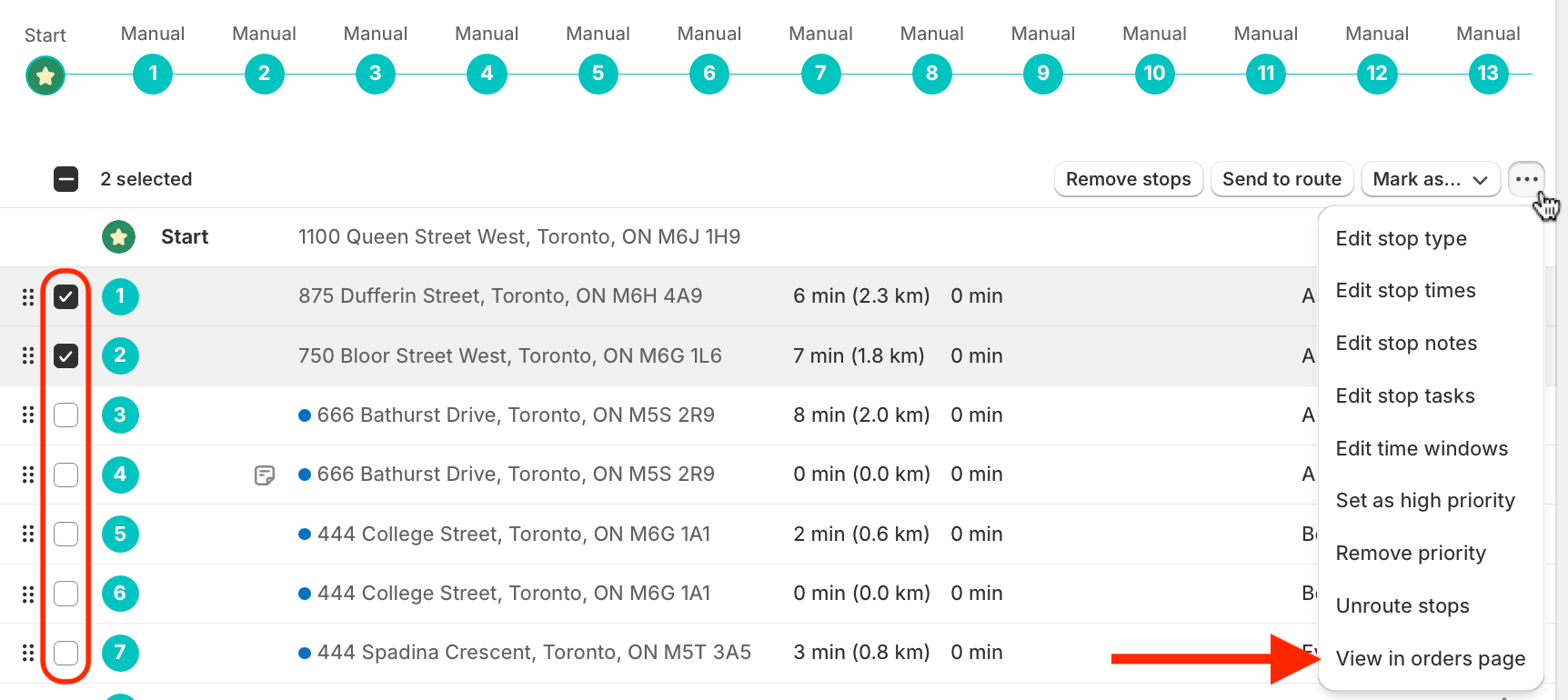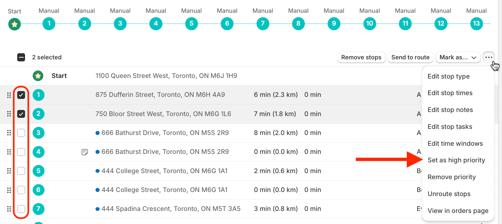Use the checkboxes to select the stops you wish to mark as High Priority. From the menu that appears in the upper right-hand corner of the table, click into the More actions menu (three dots icon) and select Set as high priority: