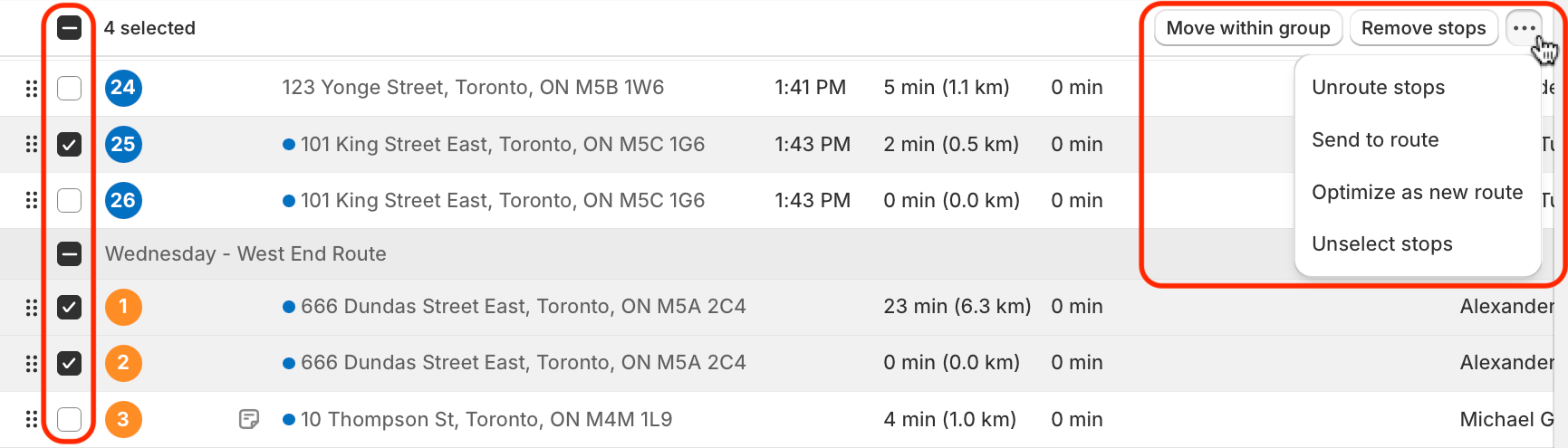 - Use the Optimize as a new route action to create a new route within the existing group, move the selected stops there, and optimize it.