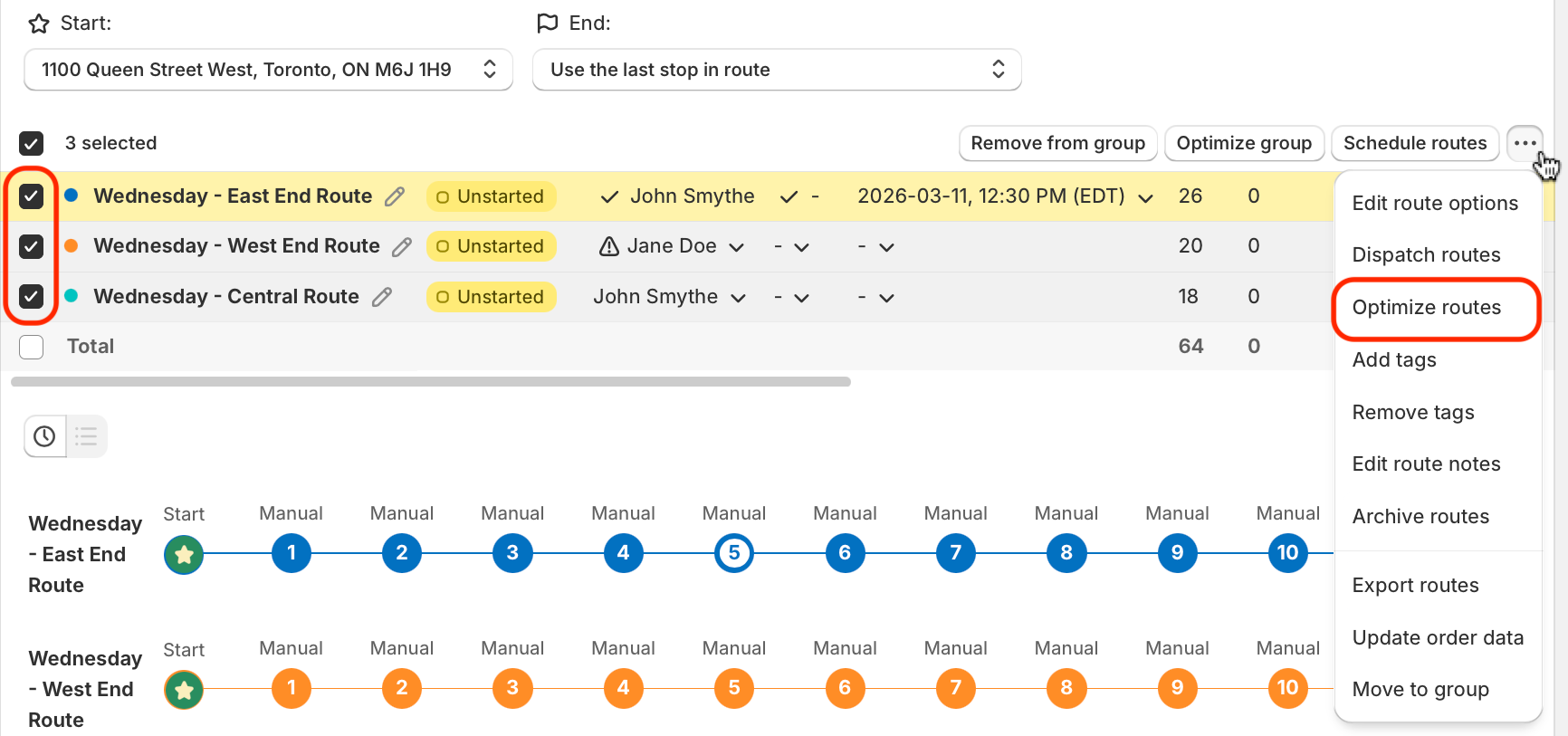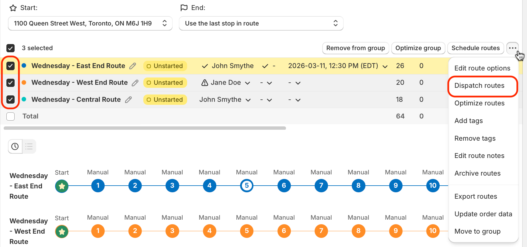From the All routes view of any existing route, use the checkboxes to select which routes to dispatch; from the menu that appears in the upper right-hand corner of the table, click into the More actions menu (three dots icon), and select Dispatch routes: