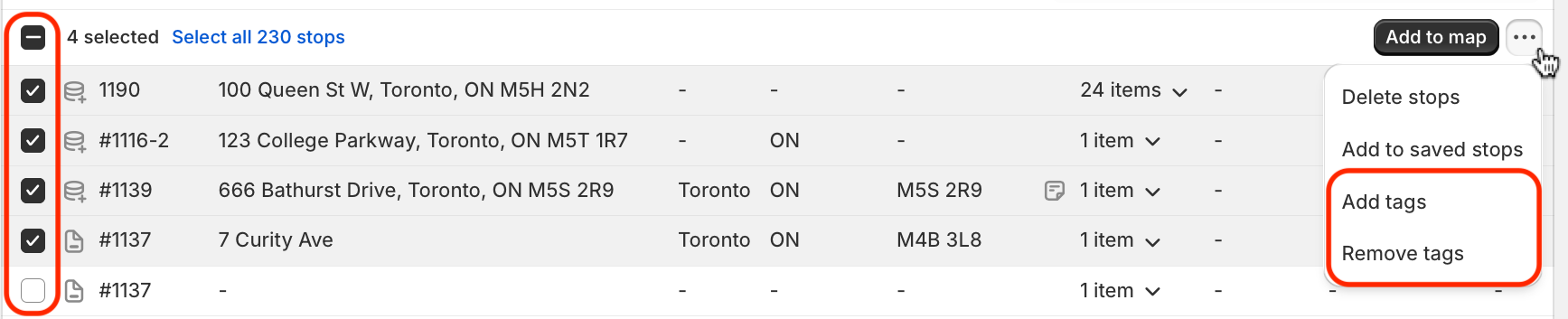 Note: The add/remove tags bulk actions apply only to stops imported into EasyRoutes via CSV file, the EasyRoutes API, or Zapier import stops action. We recommend taking advantage of Shopify's native bulk tagging feature to add/remove tags for Shopify orders, which will automatically sync into the EasyRoutes Orders page for applicable orders.