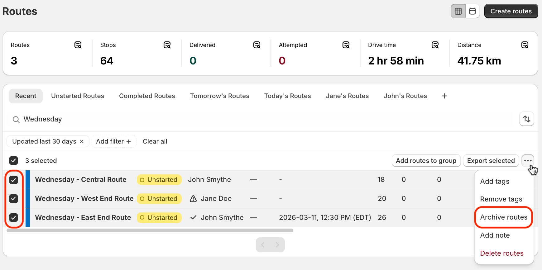 Use the checkboxes to select routes you'd like to archive. Click the More actions button (three dots icon) from the menu that appears in the upper right-hand corner of the table, and select Archive routes: