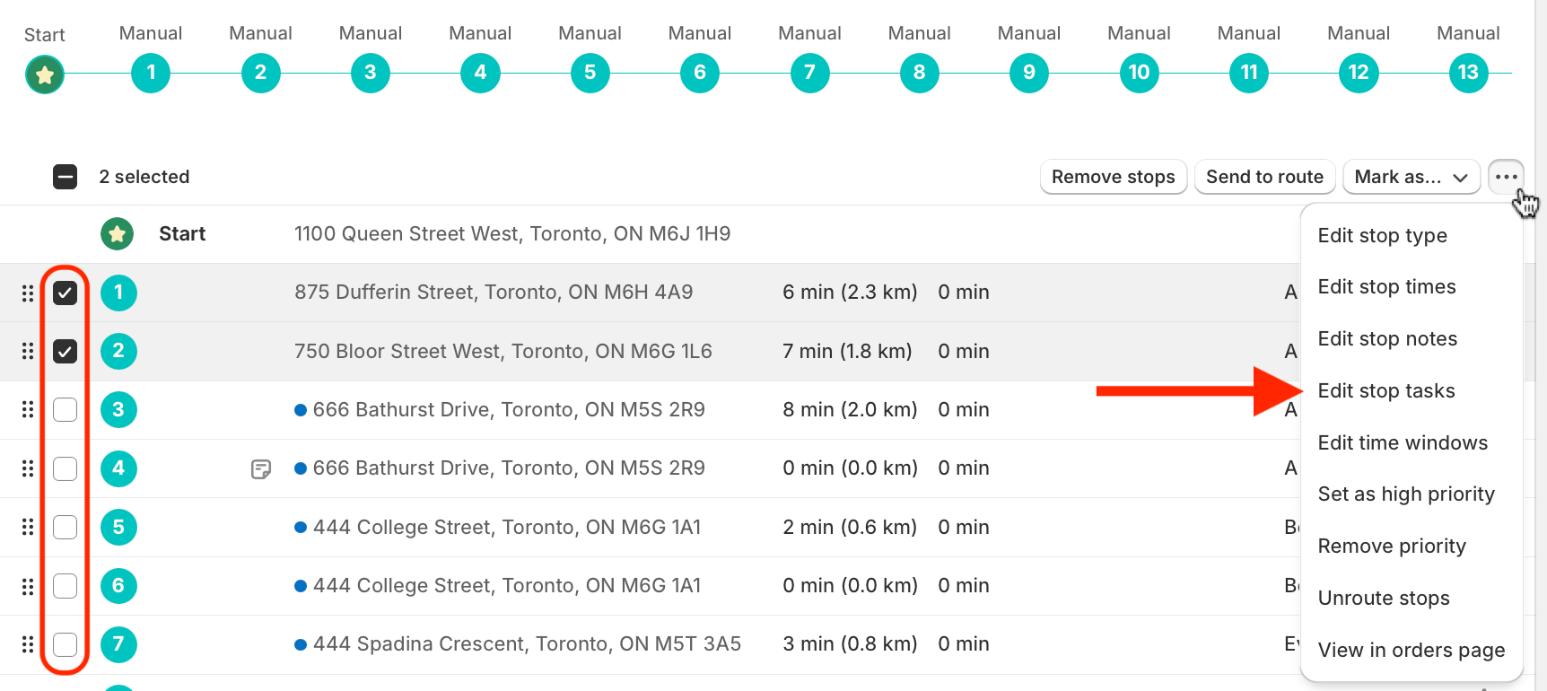 Access any previously created route and follow the steps below to bulk re-order stops, apply delivery statuses to multiple stops, edit stop times, tasks, or priority status of multiple stops and more.