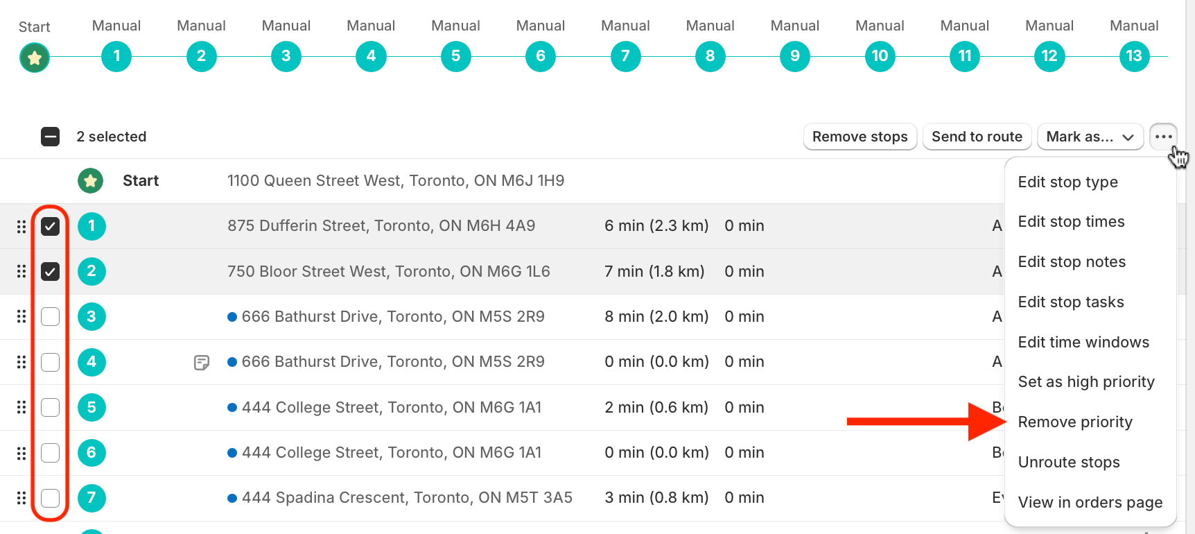 If a stop is already marked as High Priority, to reset the priority status to the default value, use the same workflow described above, clicking Remove priority from the More actions menu instead: