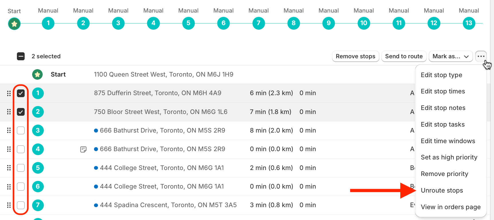 Use the checkboxes to select stops for unrouting. From the menu that appears in the upper right-hand corner of the table, click into the More actions menu (three dots icon) and select Unroute stops: