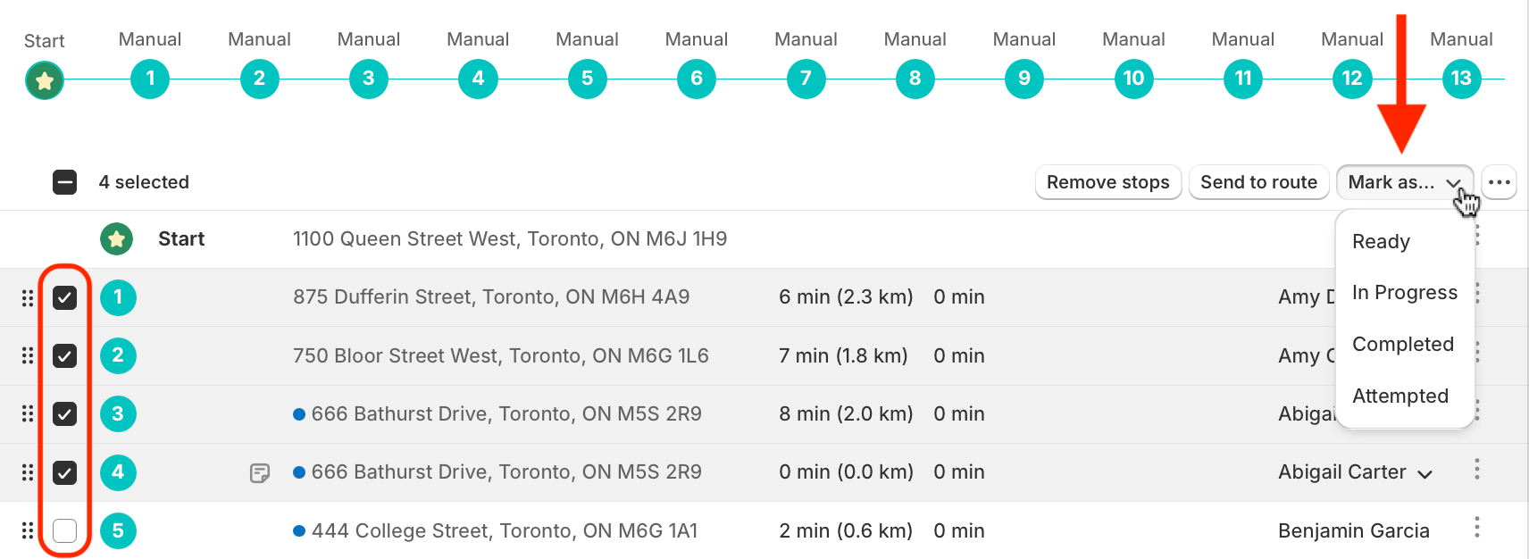 Use the checkboxes to select stops to mark with a new delivery status. From the menu that appears in the upper right-hand corner of the table, click into the Mark as... menu and select the delivery status you'd like to apply to these stops: