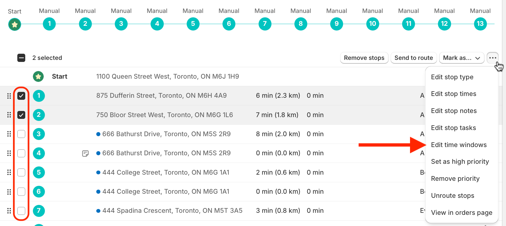 Use the checkboxes to select stops to edit or add delivery time windows. From the menu that appears in the upper right-hand corner of the table, click into the More actions menu (three dots icon) and select Edit time windows: